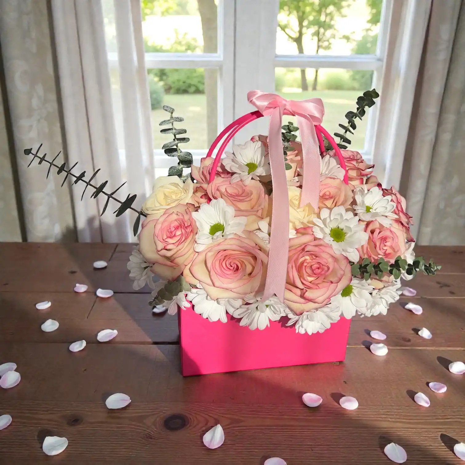 This elegant bloom box is designed to capture softness, romance, and refined beauty. It features premium blush pink roses carefully arranged with fresh white daisies and natural eucalyptus greenery, creating a light, airy, and balanced floral composition. The gentle color palette adds a timeless charm that feels both graceful and uplifting.