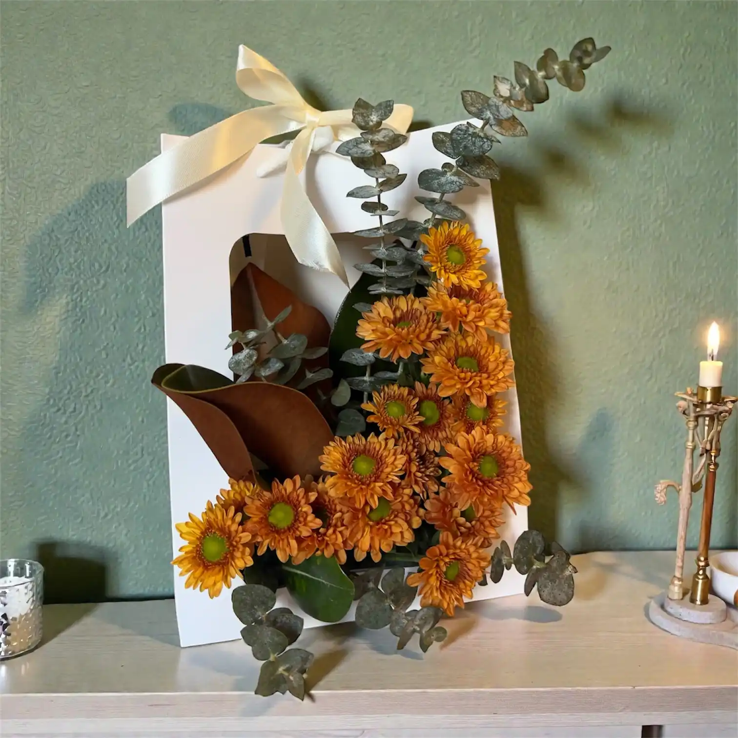 Presented in a sleek white gift box and finished with a delicate ribbon, this arrangement blends modern simplicity with seasonal charm. Its compact yet expressive design makes it perfect for autumn décor, thank-you gifts, birthdays, housewarmings, or thoughtful gestures during the fall months. The Golden Autumn Charm Box brings warmth, elegance, and a welcoming atmosphere to any space it graces.